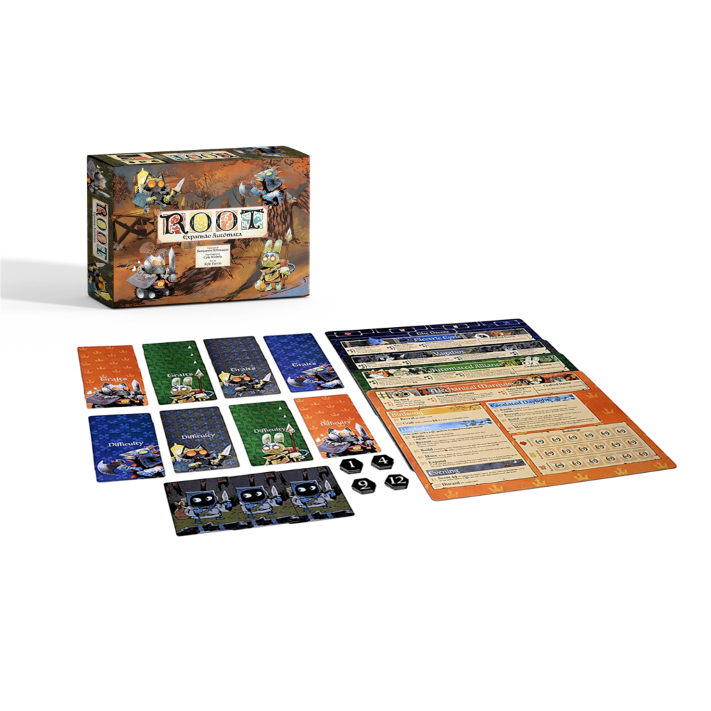 A caixa de Root: Expansão Autômata inclui quatro facções automatizadas com três níveis de dificuldade cada, proporcionando uma experiência de jogo rica e variada. Além disso, mais de uma dúzia de cartas de traços adicionam habilidades especiais e novas estratégias para os autômatos, ampliando ainda mais as possibilidades táticas.
