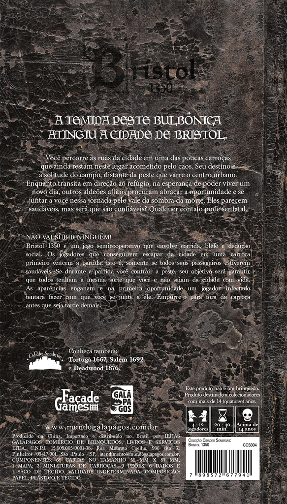 Bristol 1350 é um jogo semicooperativo que mistura mecânicas de corrida, blefe e dedução social. Vocês são aldeões tentando escapar da peste bubônica, pegando carona em carroças saindo da cidade. Se a sua carroça for a primeira a sair de Bristol e estiver cheia de aldeões saudáveis, você e seus companheiros de carroça ganham o jogo!