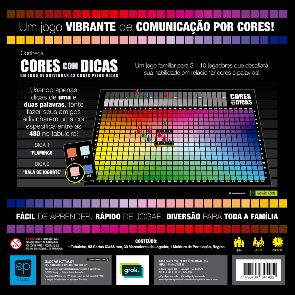 Reúna de 3 a 10 amigos para este jogo simples, mas repleto de possibilidades! Um dos jogadores escolhe uma cor de um deck de cartas, enquanto os demais tentam adivinhar qual é, marcando suas escolhas no tabuleiro. Por exemplo, a dica "Café" pode sugerir um tom marrom escuro, enquanto "Com leite" pode indicar um tom mais claro.