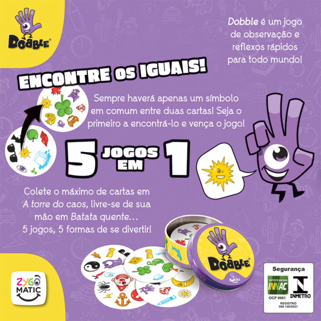 Dobble é um jogo de sucesso mundial, um verdadeiro desafio de velocidade e observação no qual todos jogam ao mesmo tempo! O objetivo é conseguir identificar qual é o símbolo em comum entre duas cartas - e cada carta tem somente um símbolo em comum com qualquer outra carta do baralho. Todos os participantes têm a mesma chance de ganhar a rodada, por isso é preciso ser ágil!