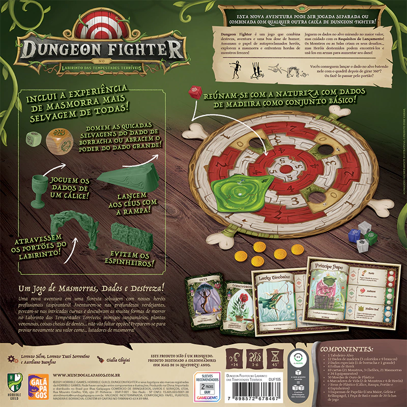 No Labirinto das Tempestades Terríveis, nosso grupo de heróis corajosos está preso em uma selva perigosa, tentando sobreviver às travessuras relacionadas à natureza desta masmorra. Apresentando um tabuleiro de alvo quase familiar, dados de seis lados de madeira, dados especiais e mais algumas experiências exclusivas da masmorra mais selvagem de todas, este é o começo perfeito para os novatos do Dungeon Fighter!