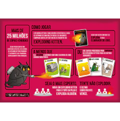 No jogo, você compra cartas até que alguém encontre um exploding kitten, o que o elimina da partida — a não ser que consiga desarmar o gatinho usando uma caixinha, pedir uma carona num porco ou usar cartas especiais para passar o risco para os outros jogadores. A dinâmica é cheia de surpresas e estratégias, fazendo com que cada rodada seja única.