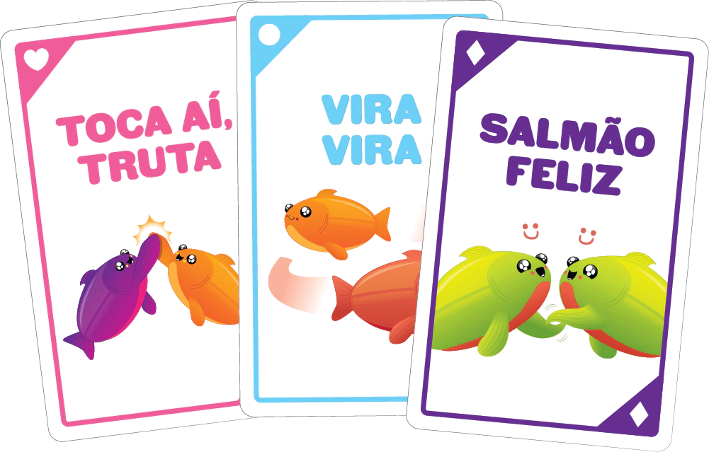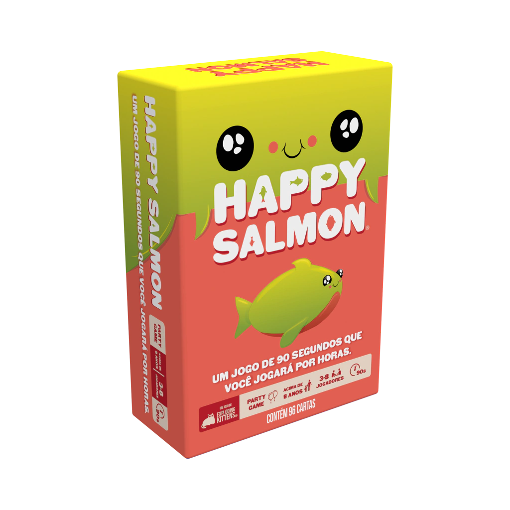 Happy Salmon é um jogo rápido – e caótico – que fará todo mundo se mexer e gargalhar em menos de dois minutos.Os jogadores gritam freneticamente suas ações para procurar por um parceiro correspondente. Em seguida, ambos os jogadores descartam suas cartas usadas e repetem o processo.