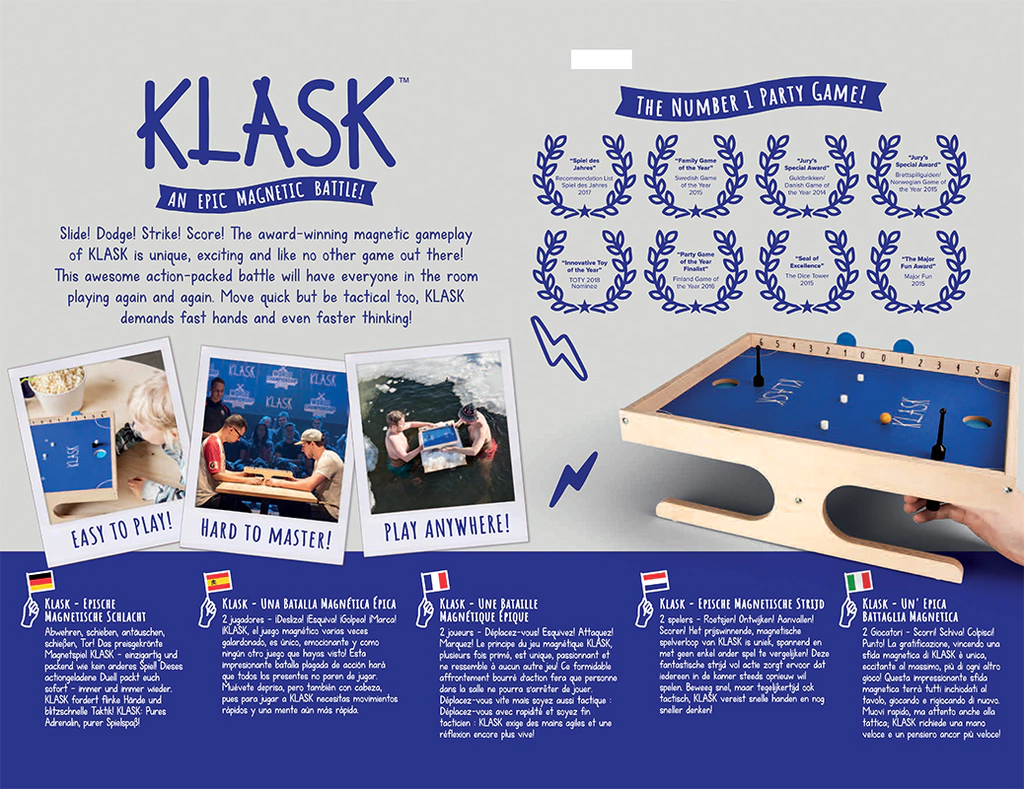 Klask é um party game diferente, à primeira vista ele parece um air hockey misturado com futebol de mesa (totó ou pebolim dependendo da região), porém ele adiciona novas dinâmicas e alguns desafios extras como os fãs que além de atrapalhar ainda podem te fazer perder pontos.