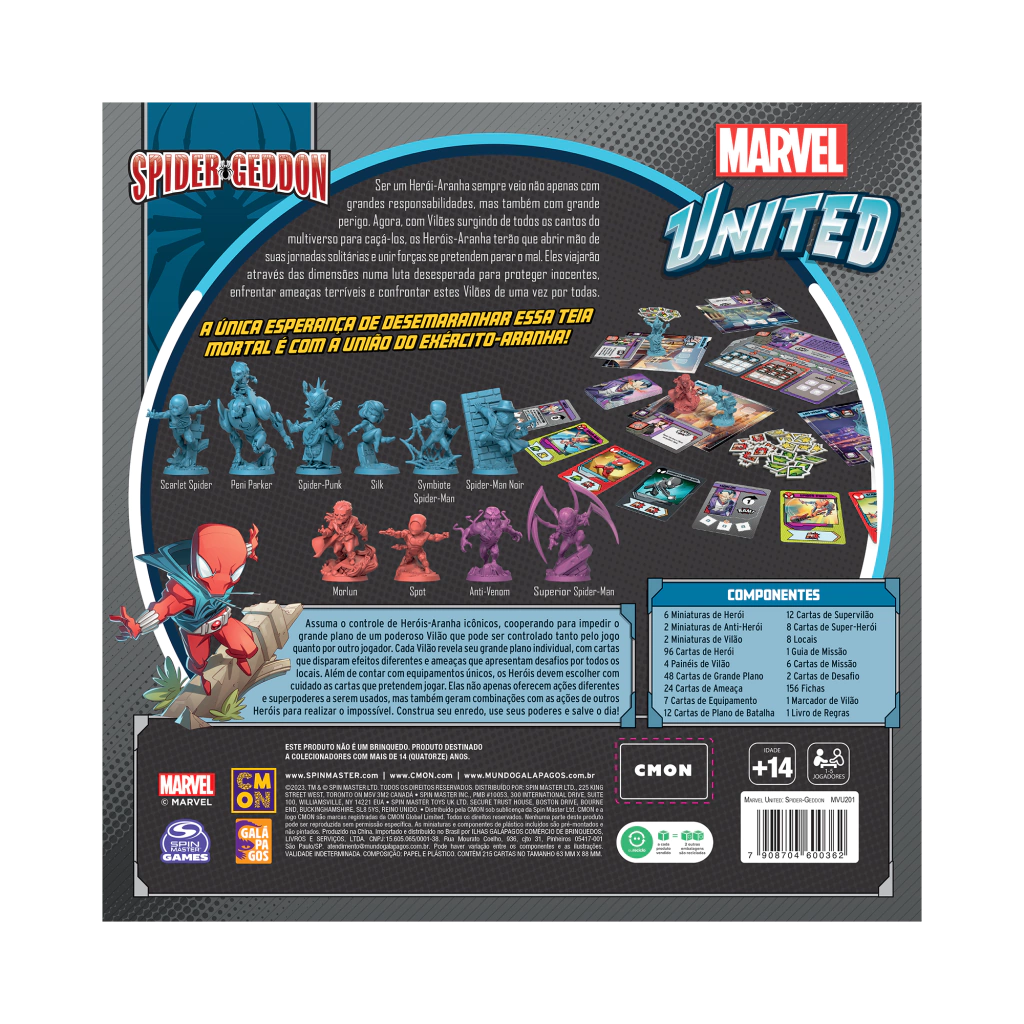 Marvel United: Spider-Geddon é um jogo base que contém tudo o que os jogadores precisam para começar a jogar Marvel United, mas também pode ser integrado a qualquer jogo base, componentes e expansões da Marvel United.