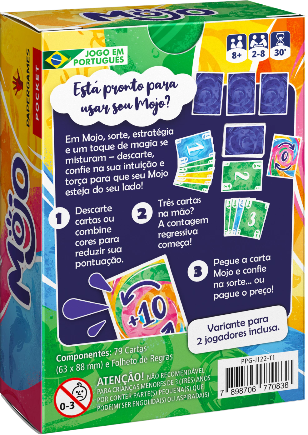 Descubra a magia de Mojo, um jogo que combina sorte, estratégia e um toque especial de carisma. O objetivo é simples: marcar o mínimo de pontos possível. Prepare-se para descartar cartas, combinar cores e acompanhar a contagem regressiva. Mas atenção! A carta Mojo pode mudar o rumo do jogo em um piscar de olhos – para o bem ou para o mal!