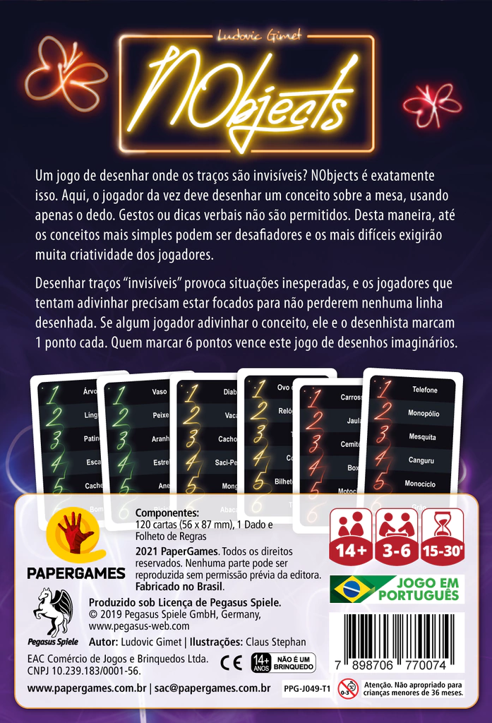 Um jogo de desenhar onde os traços são invisíveis? NObjects é exatamente isso. Aqui, o jogador da vez deve desenhar um conceito sobre a mesa, usando apenas o dedo. Gestos ou dicas verbais não são permitidos. Desta maneira, até os conceitos mais simples podem ser desafiadores e os mais difíceis exigirão muita criatividade dos jogadores.