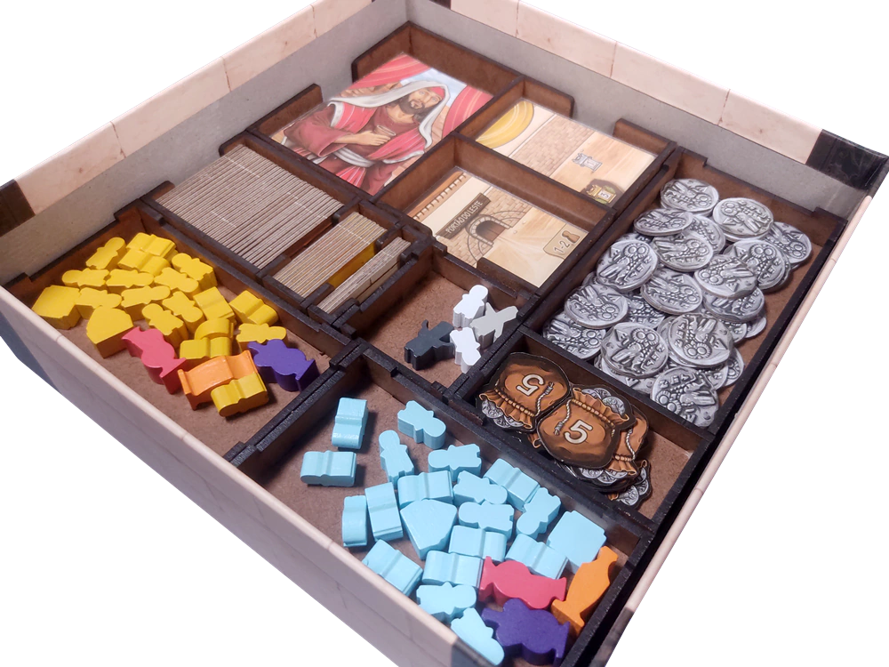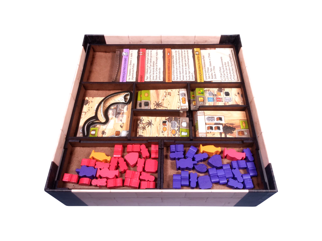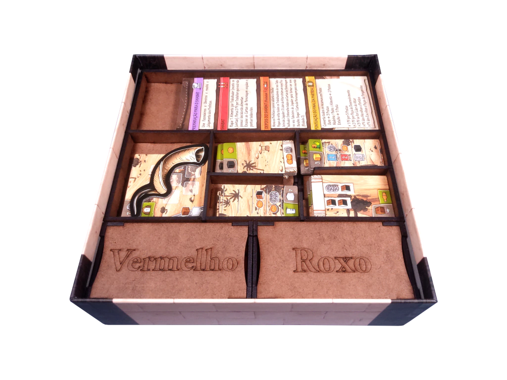 - Capacidade total: todas as cartas e marcadores do jogo cabem perfeitamente em seus espaços designados.