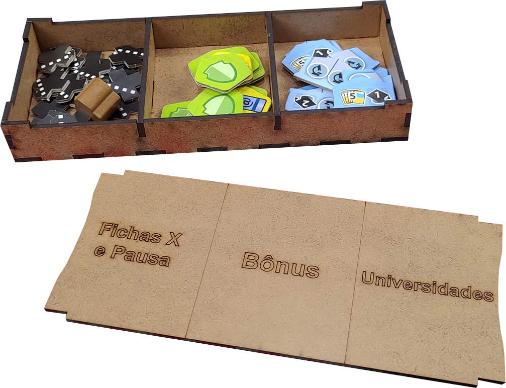 - Três caixas mantêm os marcadores de Cercados separados por tipos e tamanhos, facilitando a distribuição e utilização durante a partida.