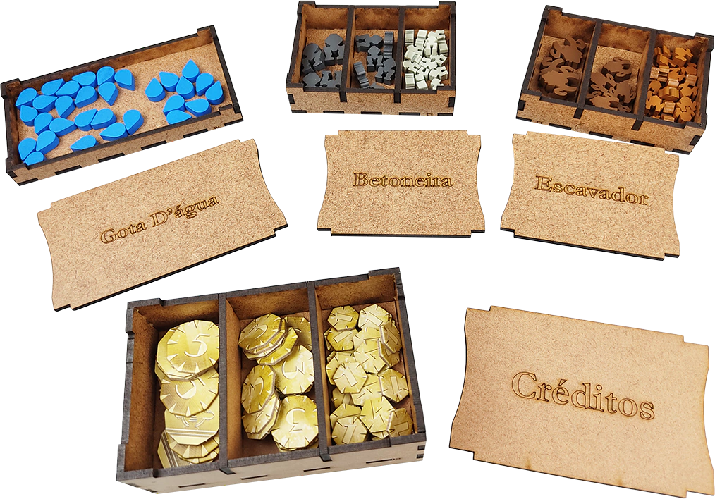 Caixas para os marcadores de Gota D’água, Betoneira, Escavador e Crédito, mantendo eles separados e ao alcance de todos durante a partida.