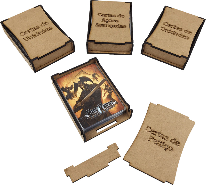 - Todas as cartas do jogo possuem um compartimento especialmente projetado para comportar sleeves (testado com sleeves Bucaneiros de espessura convencional). Elas são separadas por tipo para facilitar a organização da mesa e o andamento da partida: