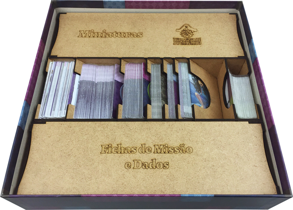 Compartimento que acomoda as cartas pequenas e grandes do jogo, com descrição na lateral para facilitar a organização.