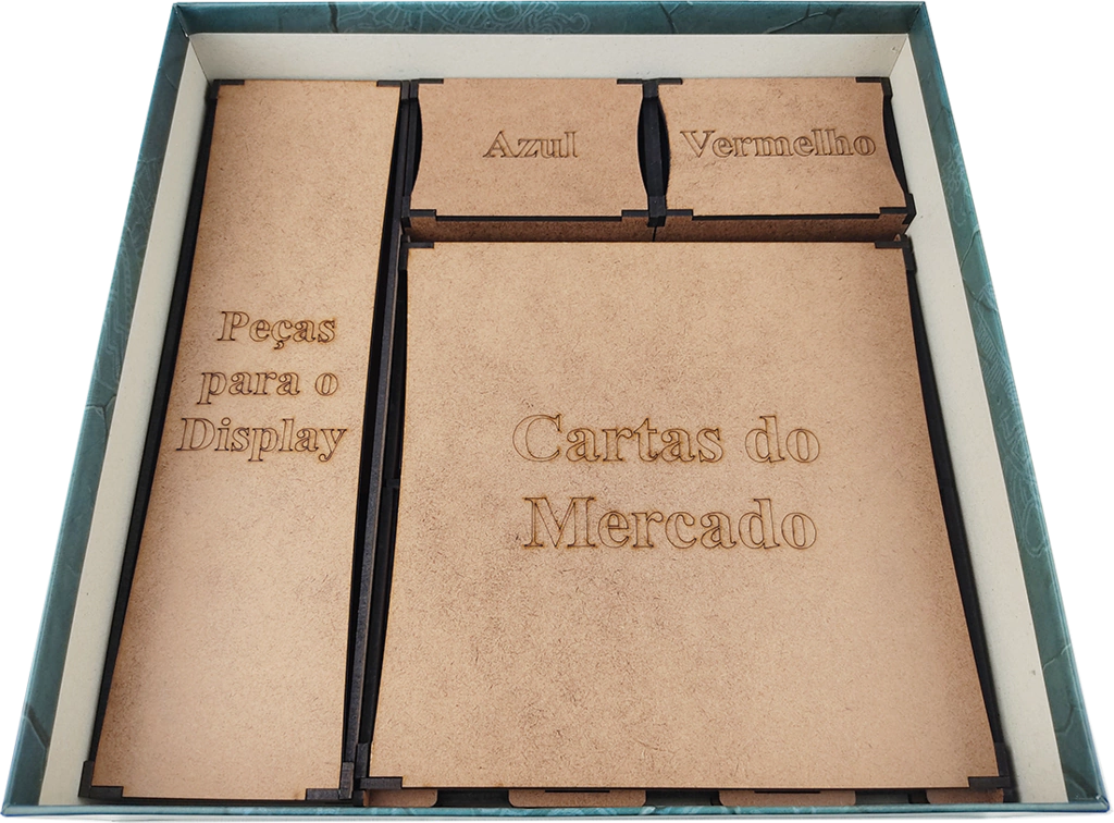 As caixas para as cartas podem ser utilizadas na horizontal ou em posição de “display”. O organizador conta com quatro suportes que permitem posicionar as quatro caixas de cartas, duas grandes e duas pequenas, na posição vertical, facilitando a visualização das cartas por todos os jogadores na mesa.