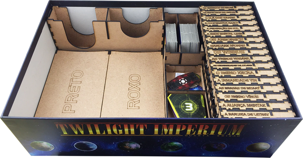 - Caixinhas para todos os demais marcadores, tiles, dados e tokens do jogo separados por tipo, agilizando o setup do jogo e organizando a partida.