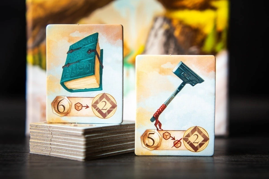 - Reclamação de Cartas: Quando todos os quadrados de uma carta de paisagem forem revisados, o jogador que coletou mais fichas reivindica a carta, ganhando um novo membro para sua festa.