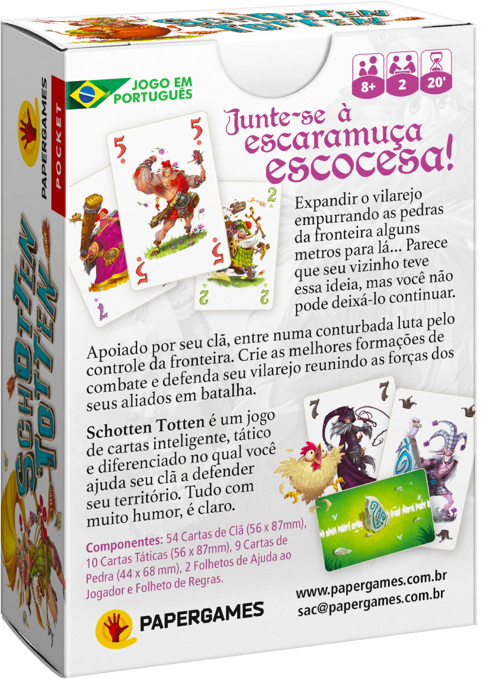 Schotten Totten é um jogo de cartas inteligente, tático e diferenciado no qual você ajuda seu clã a defender seu território. Tudo com muito humor, é claro.