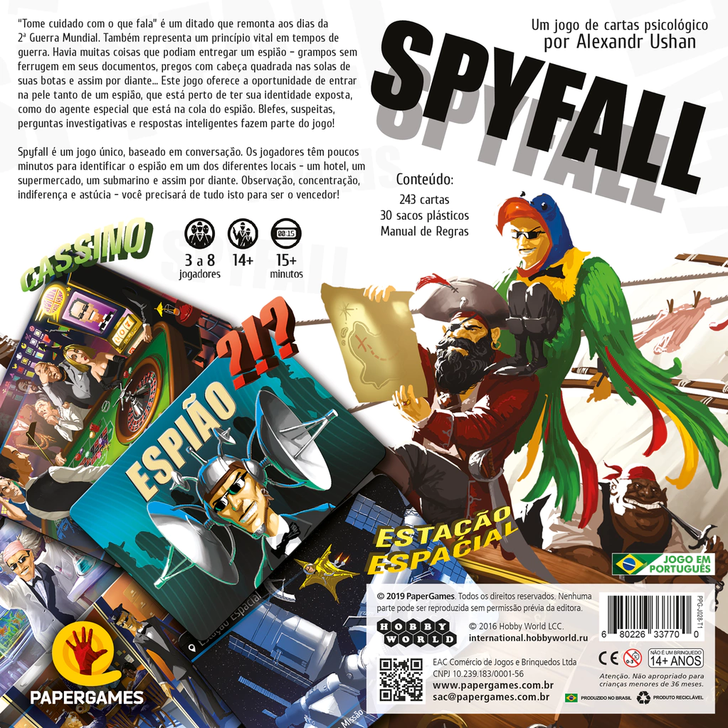 Spyfall é um jogo único, baseado em conversação. Os jogadores têm poucos minutospara identificar o espião em um dos diferentes locais – um hotel, um supermercado, um submarino e assim por diante. Observação, concentração, indiferença e astúcia – você precisará de tudo isto para ser o vencedor!