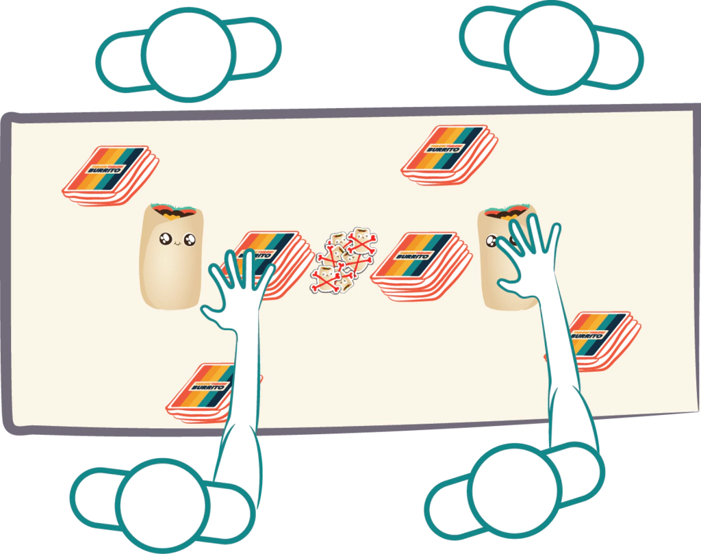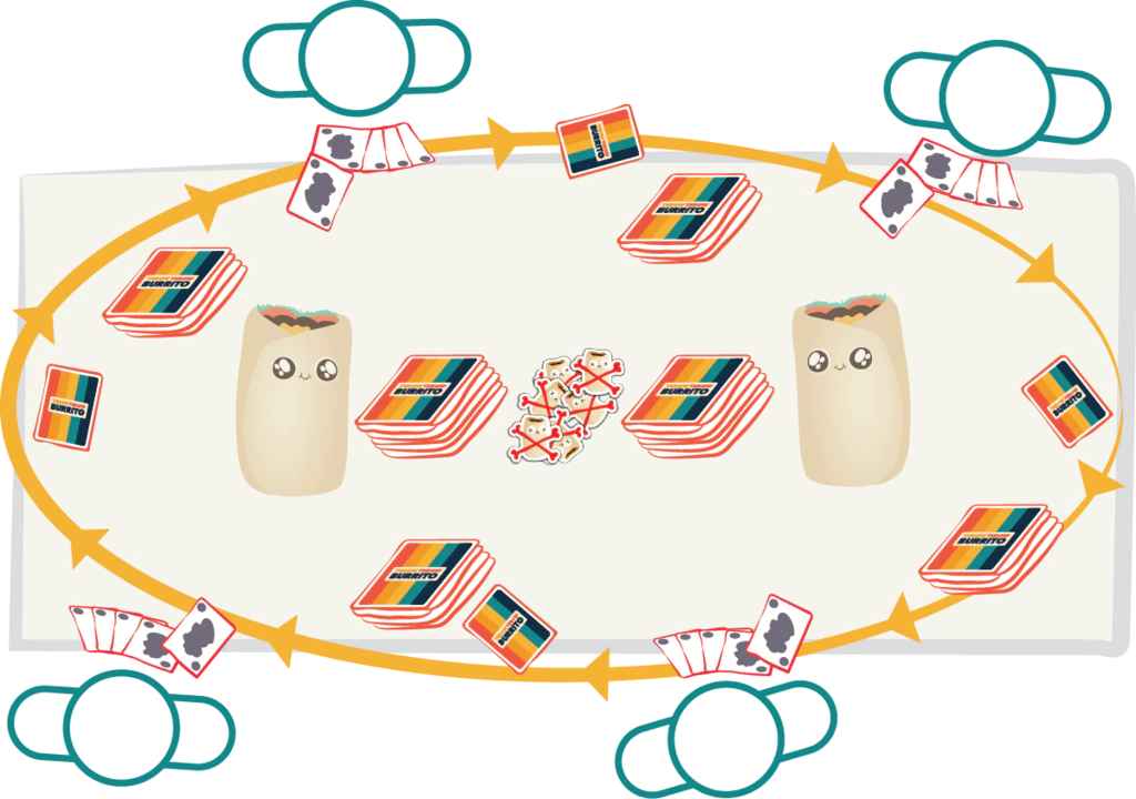 Coloque um par de burritos em uma mesa e compre cartas. Mantenha suas cartas em segredo. Acumule pontos encontrando conjuntos de três no baralho. Encontre as trincas antes de qualquer outra pessoa. Se alguém joga Cartas de Burrito, uma batalha se segue. Roube pontos de seus oponentes batendo neles com os burritos de brinquedo.