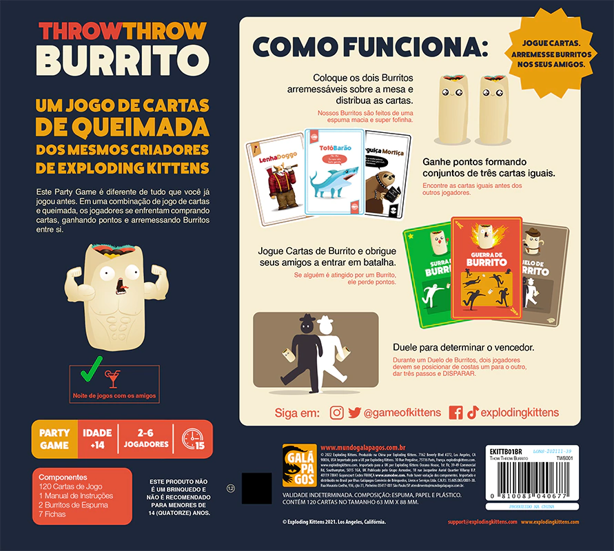 Throw Throw Burrito é um jogo que cruza jogo de cartas com queimada. Tente coletar trincas de cartas iguais mais rápido que seus oponentes enquanto, ao mesmo tempo, abaixa, desvia e joga burritos pelo ar!