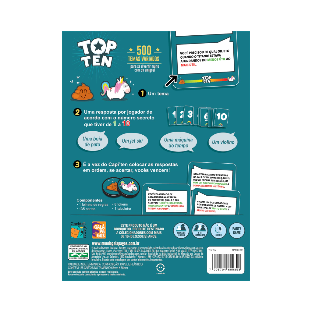 Prepare-se para muita diversão e risadas com o Top Ten! Ideal para famílias e grupos de amigos que buscam uma experiência de jogo envolvente e divertida. Adquira já o seu e comece a se divertir!